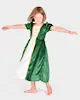 Short sleeve green satin velvet dress with zip closure at back. Gold and satin details.