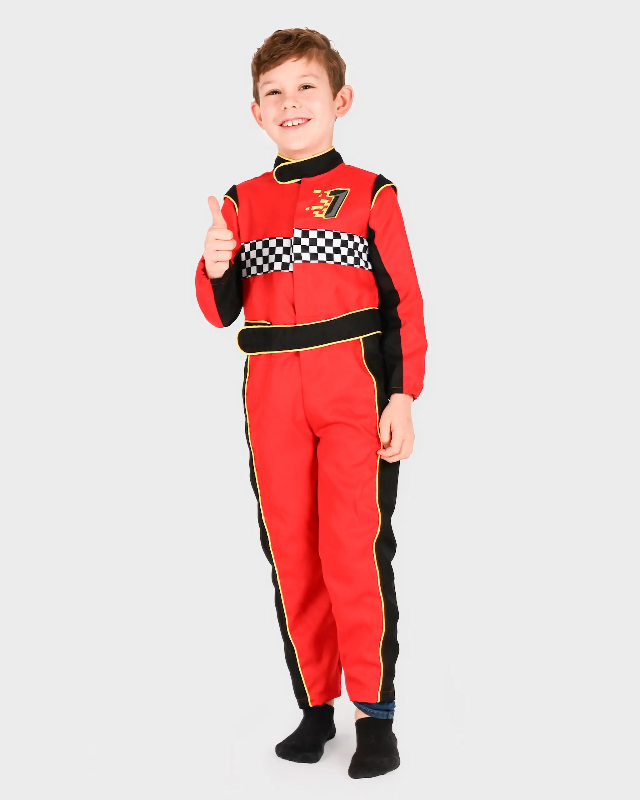 Red racer overall with zip at front and belt with burdock closure.
