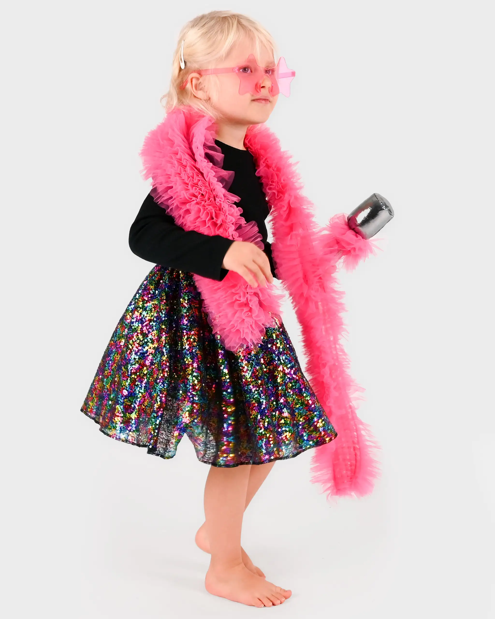 Multi color tutu set with multi color sequin skirt, hot pink boa, silver mic and hot pink plastic star sunglasses.