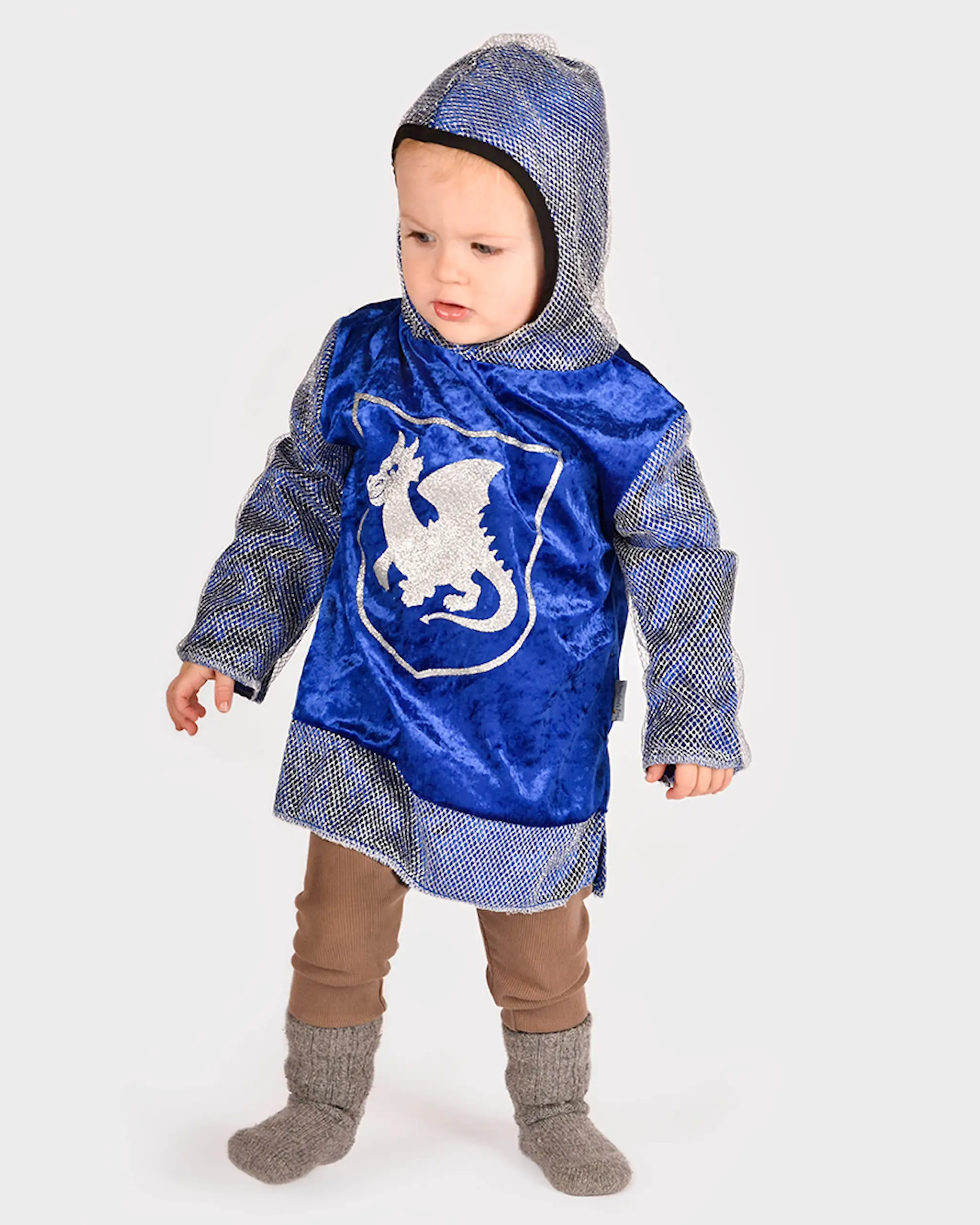 Knight shirt in blue crushed velvet.Silver details and hood. Silver print on the chest.