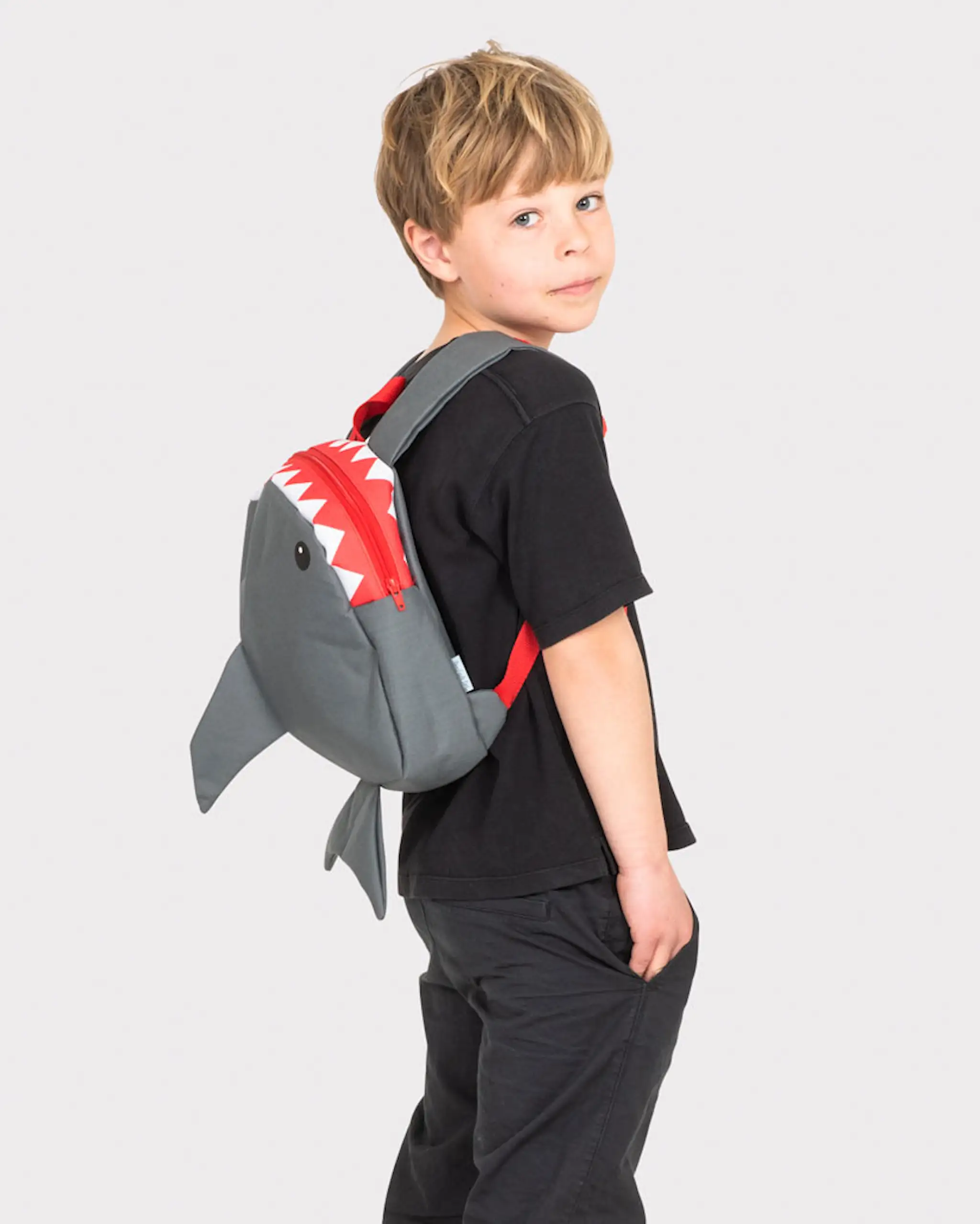 Shark backpack. 100% polyester. Partly padded. Adjustable shoulder strap. Zip closure.