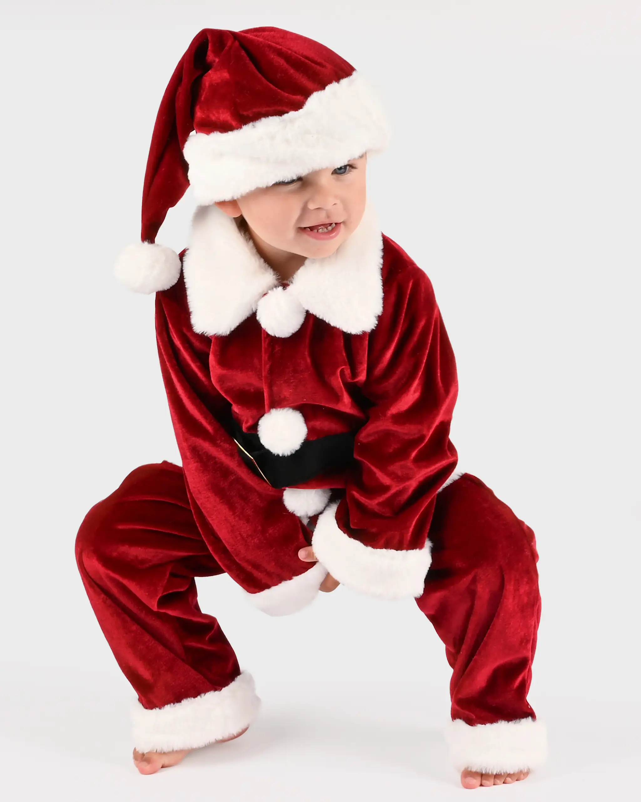 Christmas set. Trousers, Top and hood. Crossed velvet. Hook and loop fastner at front on top.