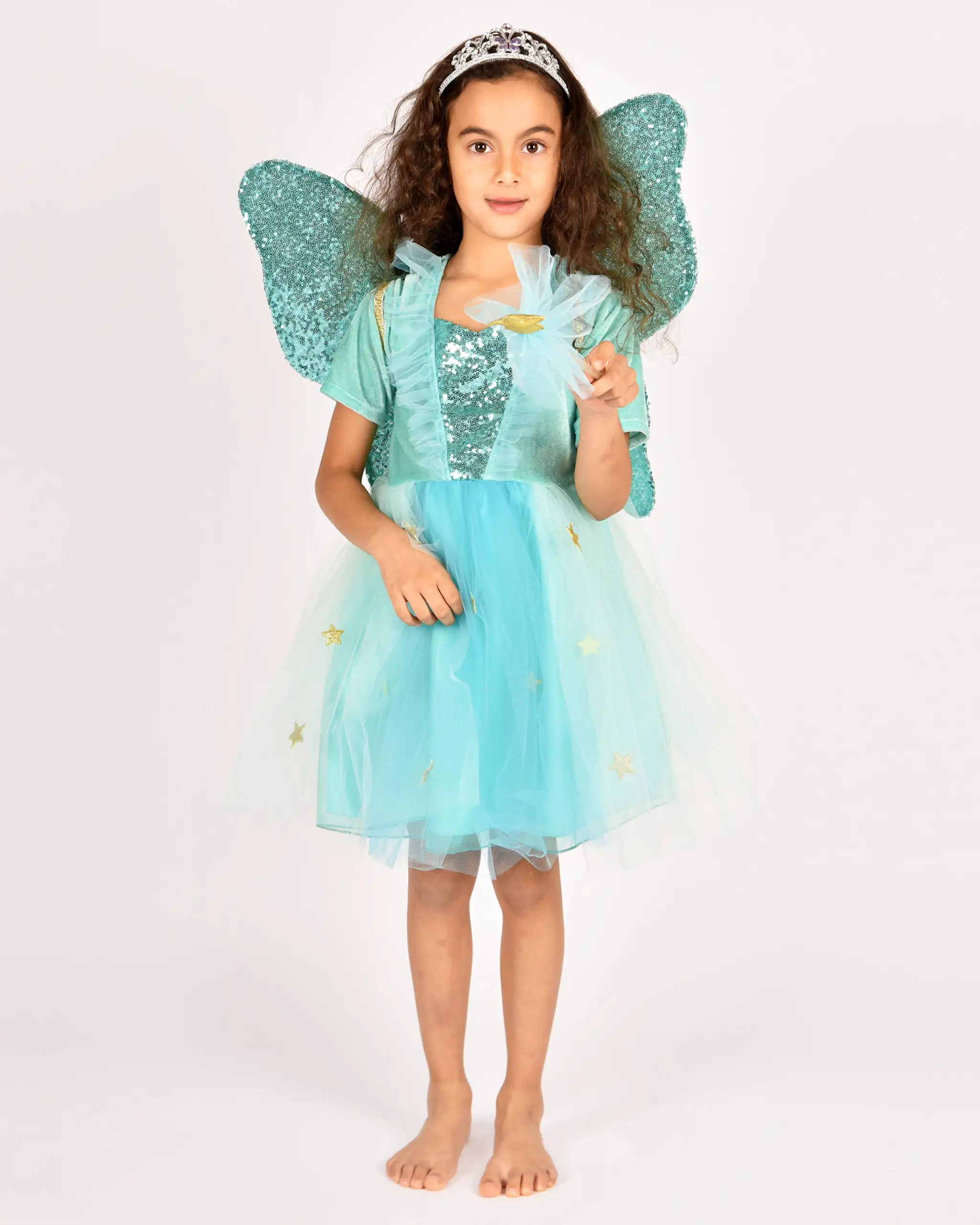 Den goda fen costume including dress, wand and fairy wings. Chiffon and gold details.