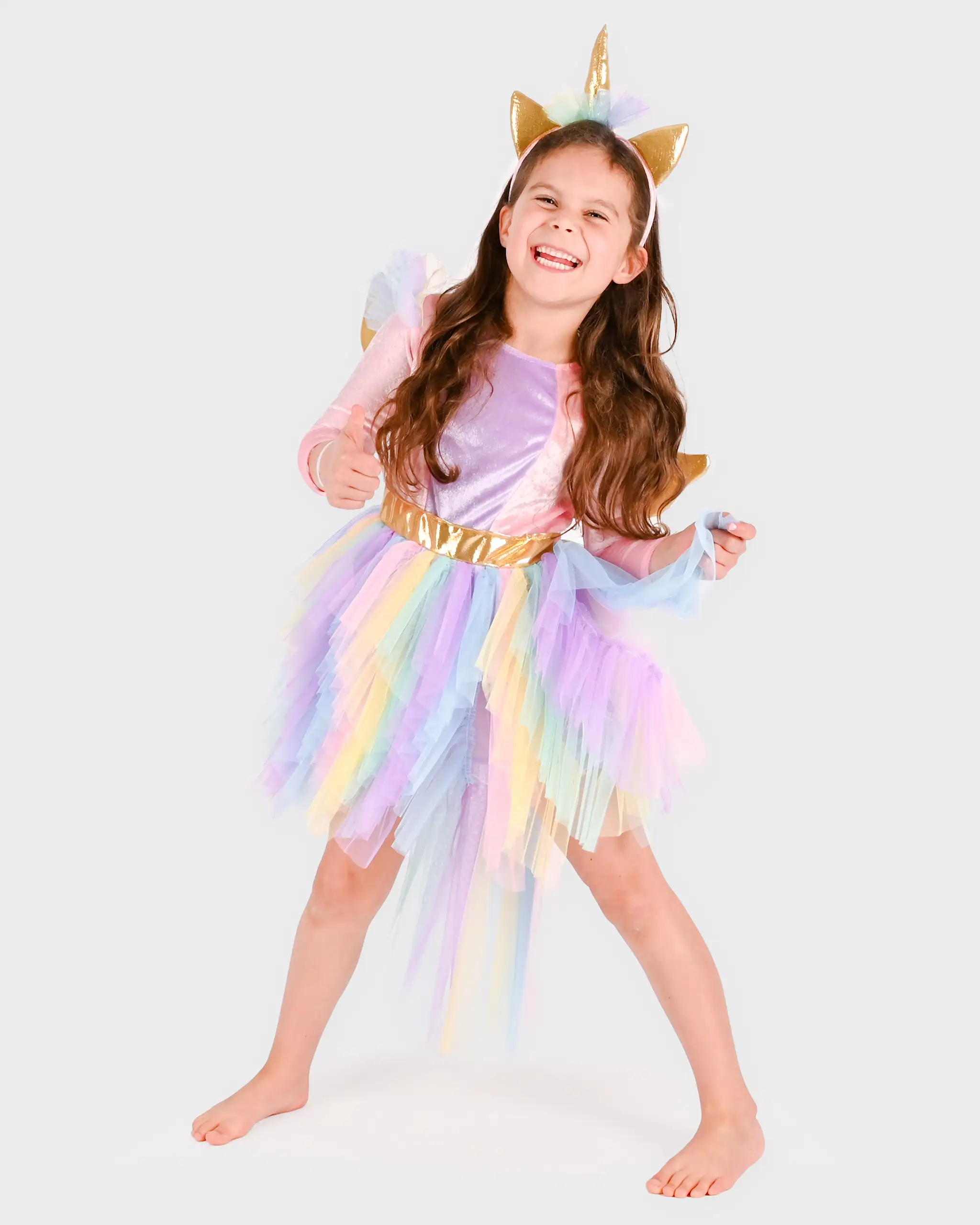 Unicorn dress w diadem and lightly padded golden wings removable with burdock solution.