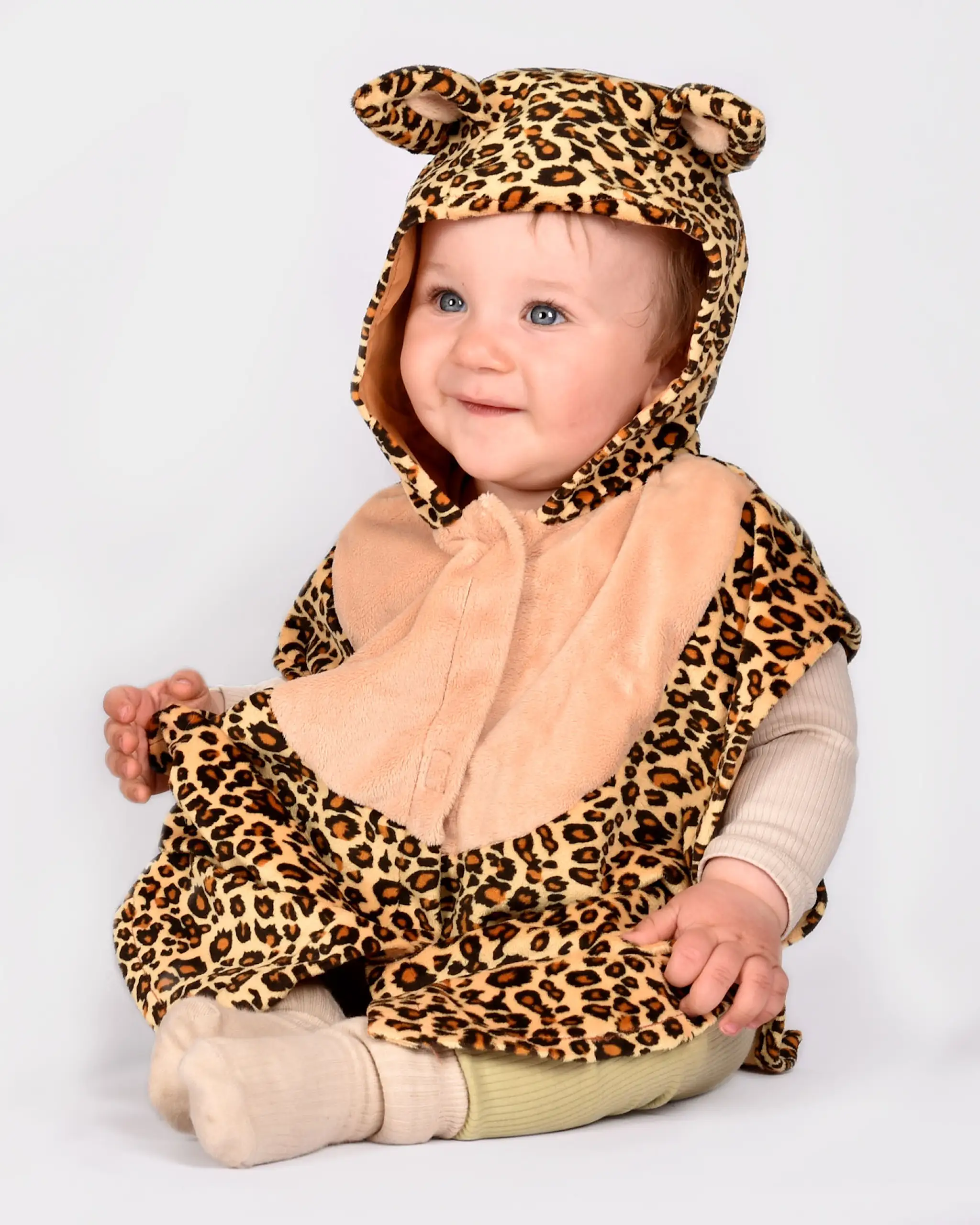 Leopard mini cape with hood. Tail in the back. Velcro closure in the front and elastic ribbons on the sides. .