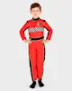 Red racer overall with zip at front and belt with burdock closure.